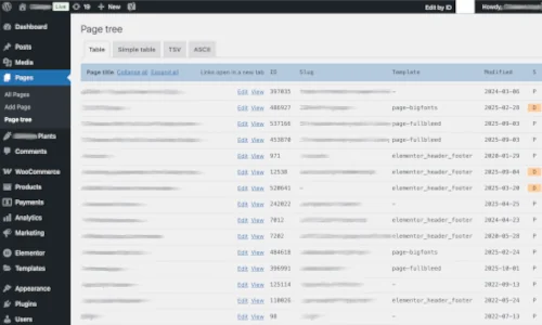 WordPress plugin showing an advanced view of a site's page hierarchy and post metadata.
